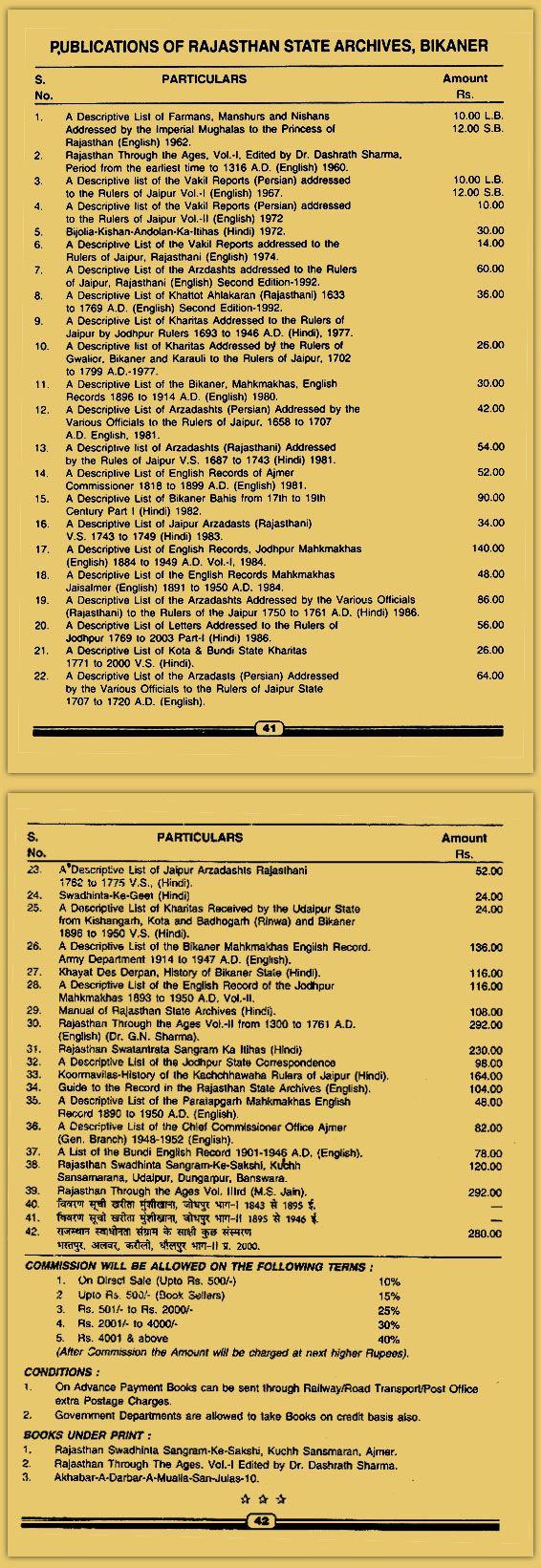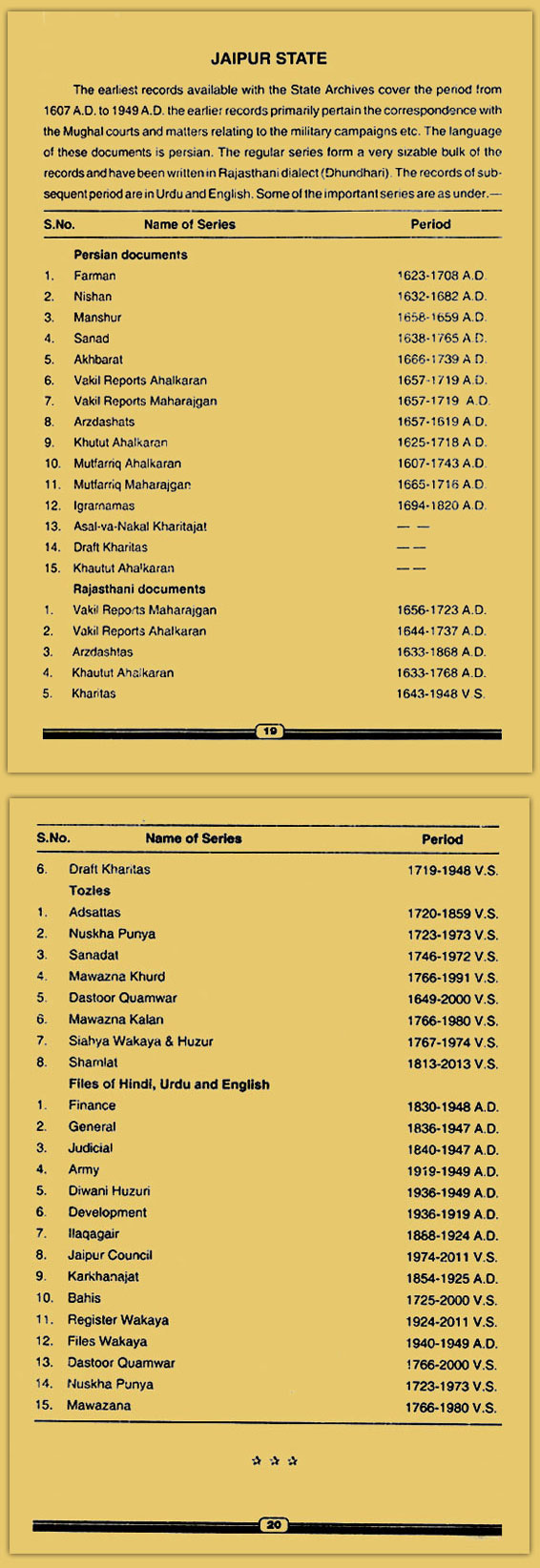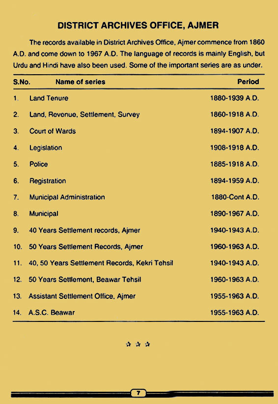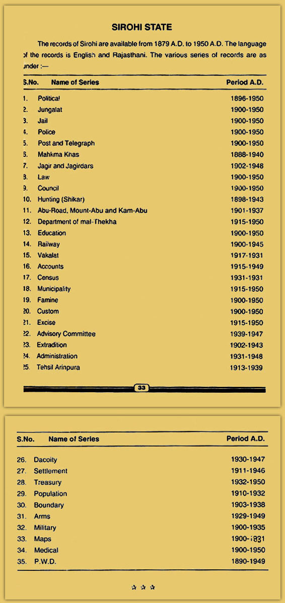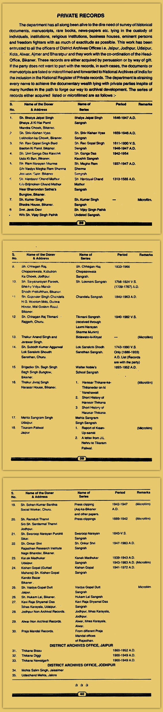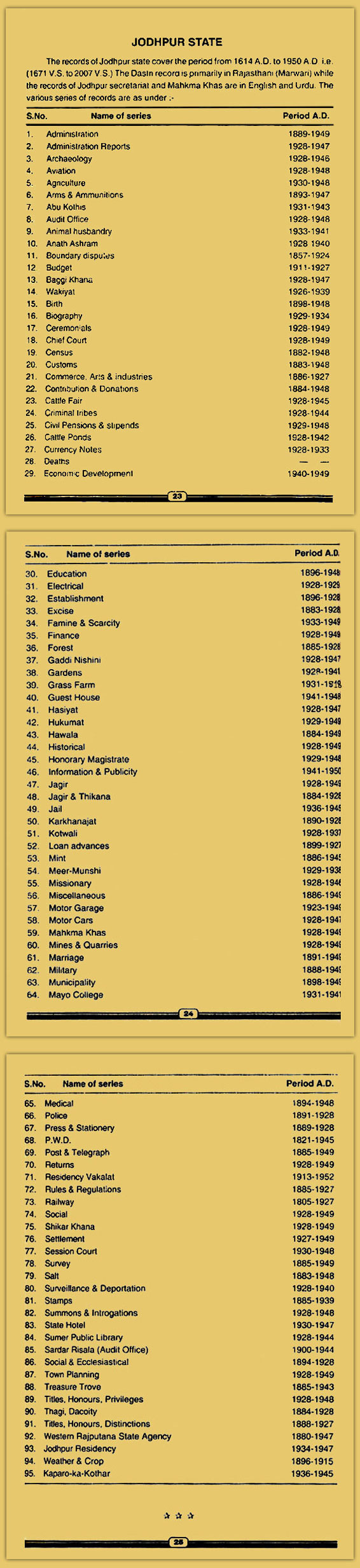 On the eve of 51st session of Indian Historical Records Commission, the department brought out the bulletin entitled "A Preliminary Guide to the Rajasthan State Archives". The publication was widely used by Research Scholars & the other users of the records, as it contained a vast information about the holdings of the records in the Head Office as well as in the branch offices giving various series including period & heads. Looking to the need & demand of users, the second edition has been published adding more information with regards to private records & Oral History references, including photographs etc. I hope this second edition will be very useful to those for whom it is meant. I am thankful to Shri Narsing Lal Kiraroo, Archivist, Shri K.P. Joshi, Chemist, and Shri Tribhuwan Nath Upadhyay & Shri Abdul Sattar who assisted in bringing out this publication.