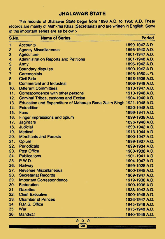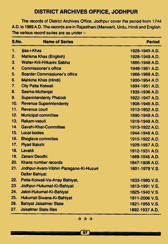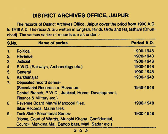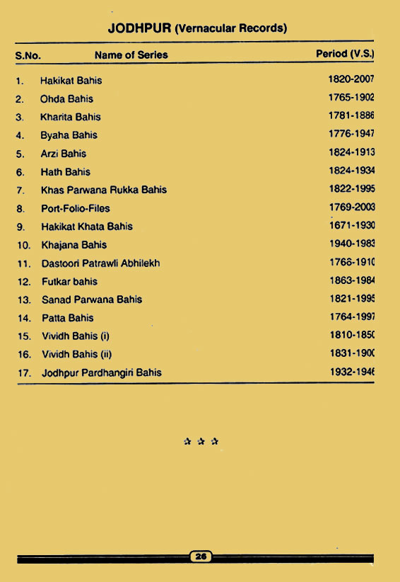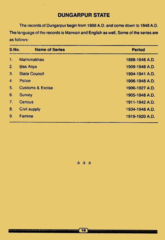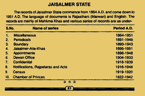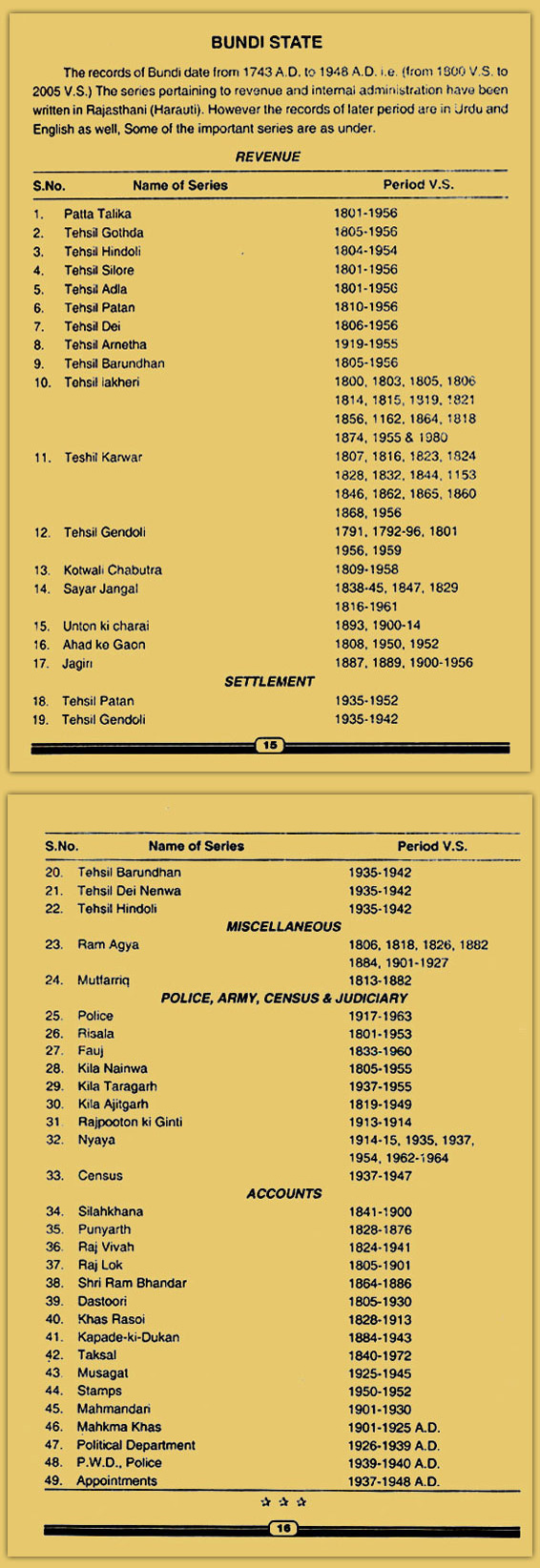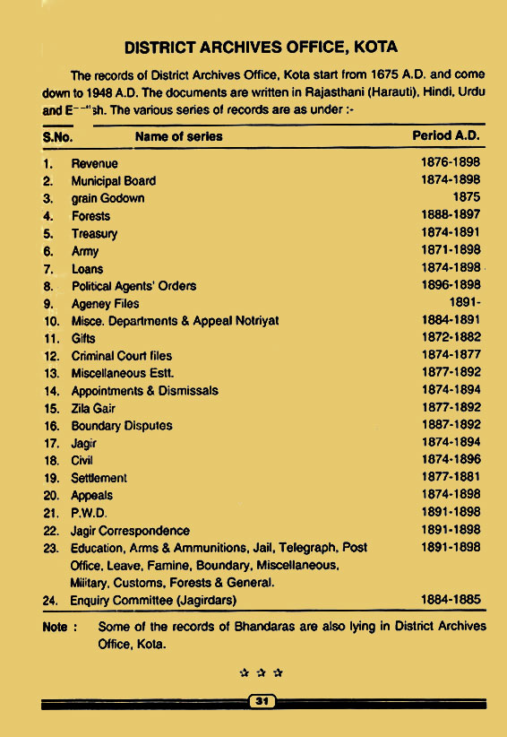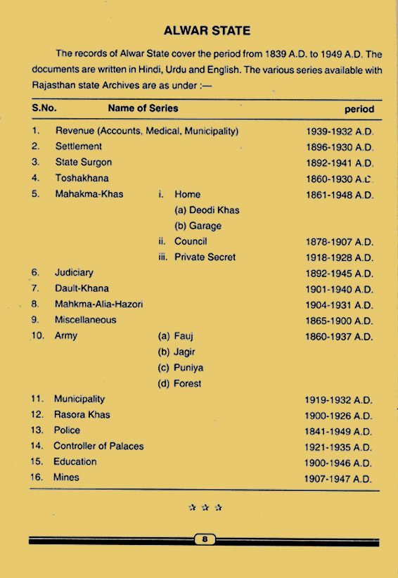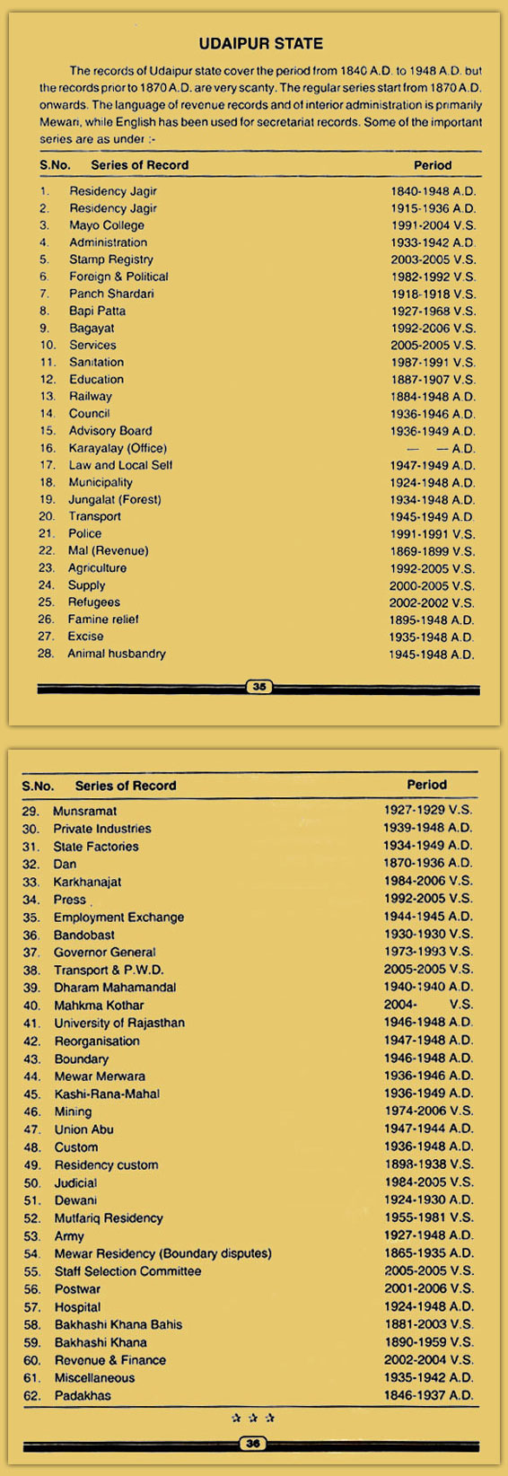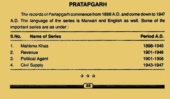 On the eve of 51st session of Indian Historical Records Commission, the department brought out the bulletin entitled "A Preliminary Guide to the Rajasthan State Archives". The publication was widely used by Research Scholars & the other users of the records, as it contained a vast information about the holdings of the records in the Head Office as well as in the branch offices giving various series including period & heads. Looking to the need & demand of users, the second edition has been published adding more information with regards to private records & Oral History references, including photographs etc. I hope this second edition will be very useful to those for whom it is meant. I am thankful to Shri Narsing Lal Kiraroo, Archivist, Shri K.P. Joshi, Chemist, and Shri Tribhuwan Nath Upadhyay & Shri Abdul Sattar who assisted in bringing out this publication.