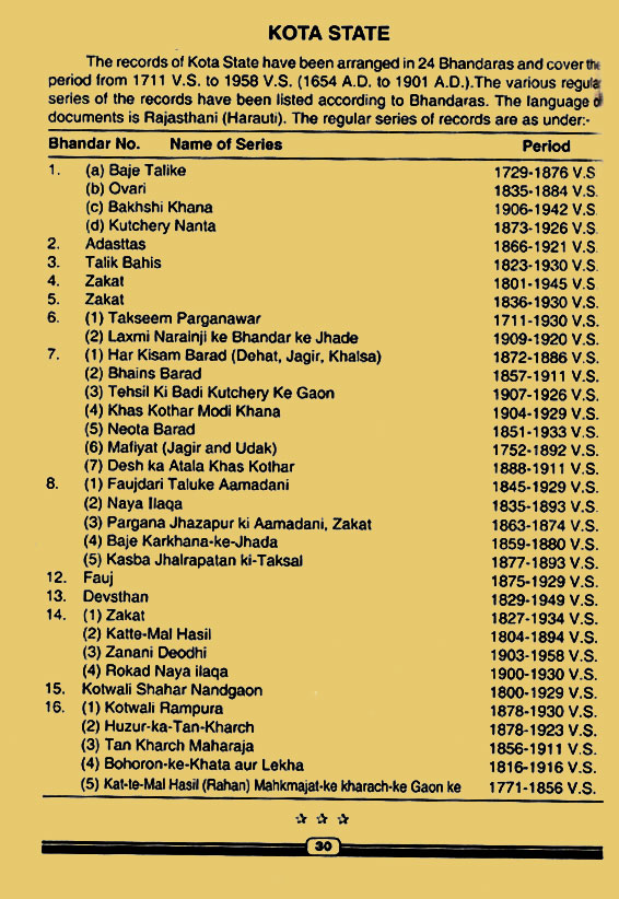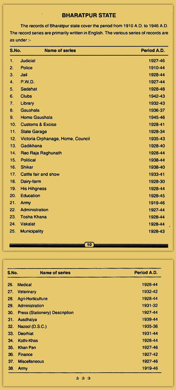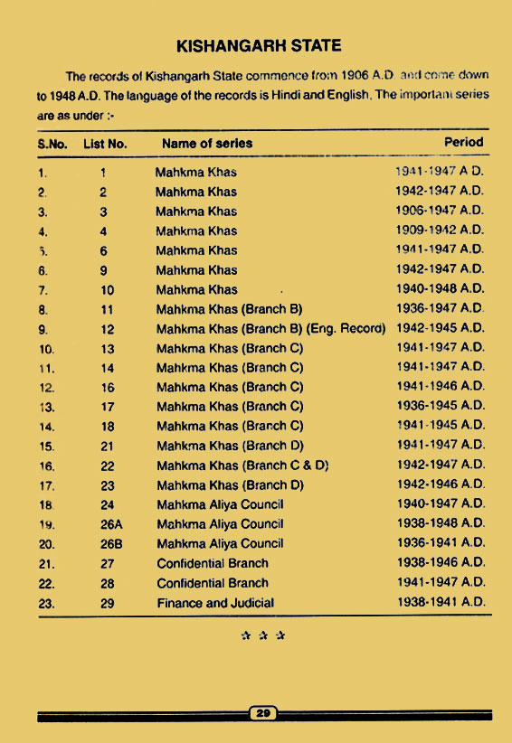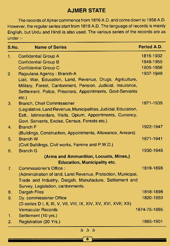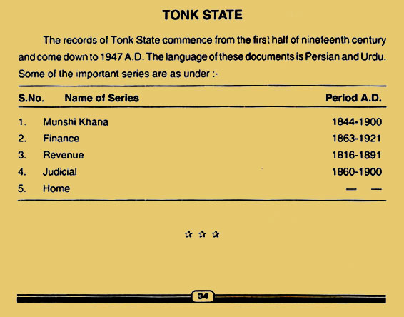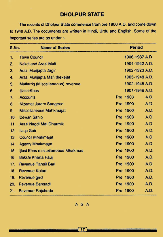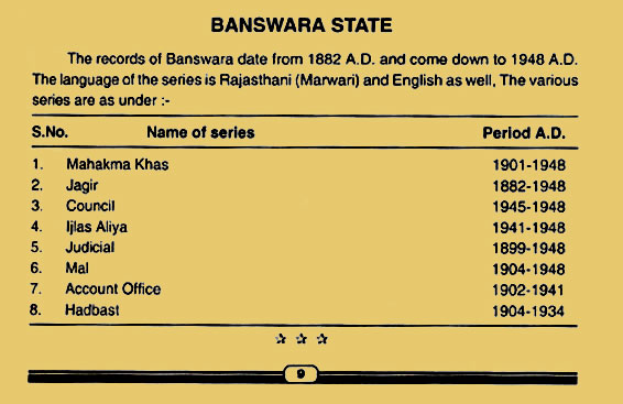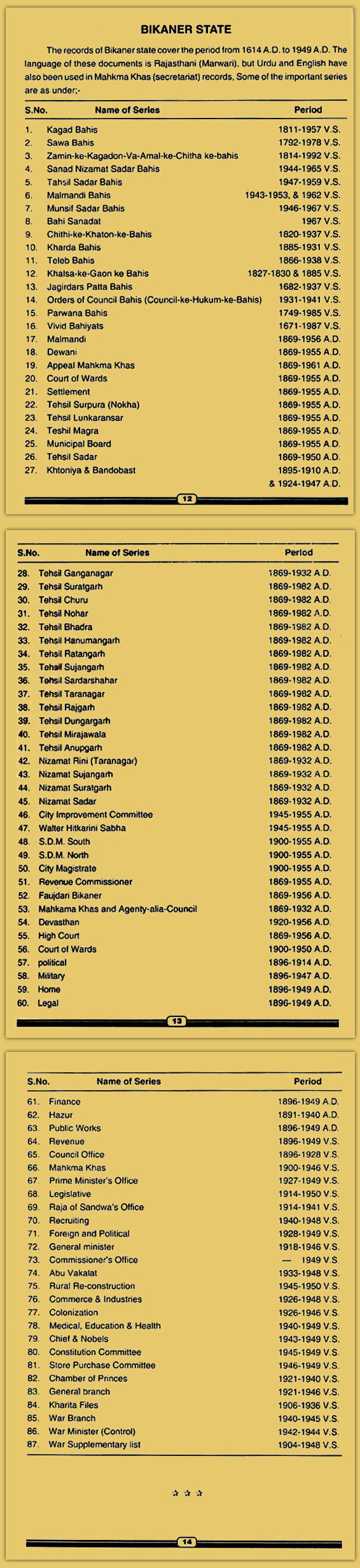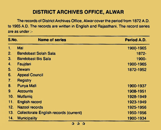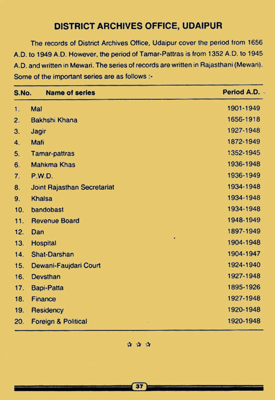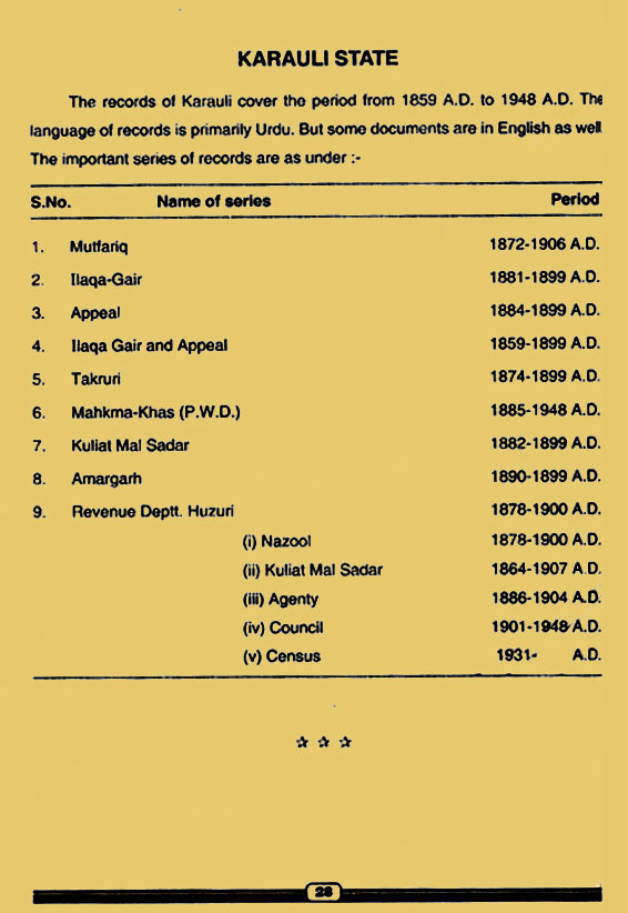 On the eve of 51st session of Indian Historical Records Commission, the department brought out the bulletin entitled "A Preliminary Guide to the Rajasthan State Archives". The publication was widely used by Research Scholars & the other users of the records, as it contained a vast information about the holdings of the records in the Head Office as well as in the branch offices giving various series including period & heads. Looking to the need & demand of users, the second edition has been published adding more information with regards to private records & Oral History references, including photographs etc. I hope this second edition will be very useful to those for whom it is meant. I am thankful to Shri Narsing Lal Kiraroo, Archivist, Shri K.P. Joshi, Chemist, and Shri Tribhuwan Nath Upadhyay & Shri Abdul Sattar who assisted in bringing out this publication.